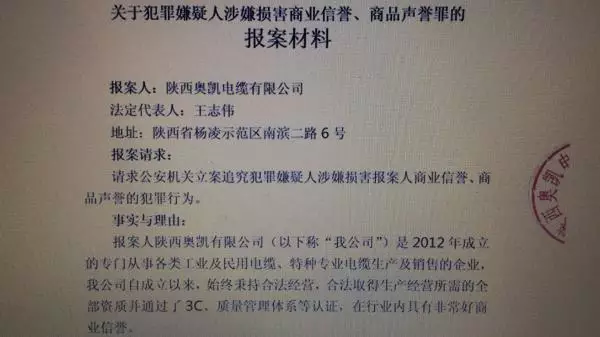 上述报案材料称,发帖人的行为,已经对奥凯电缆公司造成了严重的实质性的侵害。奥凯电缆公司声称,"截至目前(3月15日),犯罪嫌疑人的犯罪行为已经导致我公司的直接经济损失高达人民币200多万元,且经济损失在逐步扩大。"